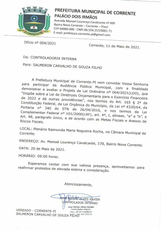 - A Prefeitura Municipal de Corrente (PI), convida para Audiência Pública Municipal, com finalidade de demonstrar e avaliar o Projeto de Lei Ordinária nº 004/2021 (LDO), "que dispõe sobre a Lei de Diretrizes Orçamentárias para o exercício de 2022 e dá outras providências".
